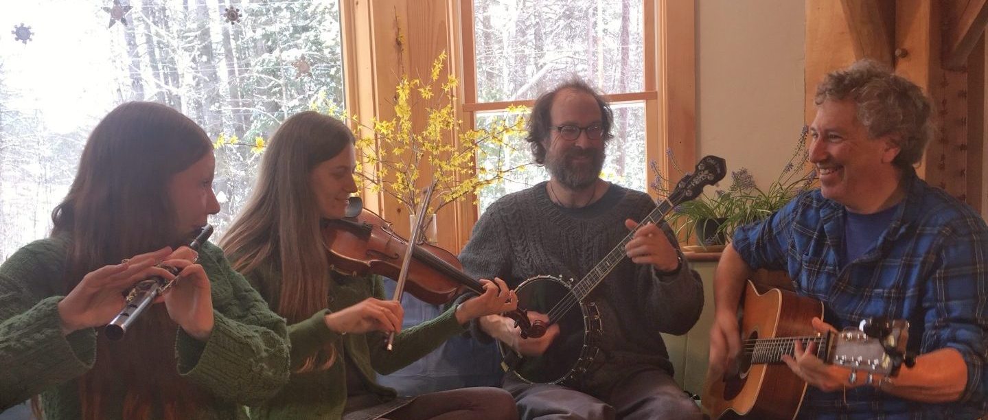 White Mountain Ceilí Band is Dexter Harding on the tenor banjo, Fiona Howell on the flute, Siena Kaplan-Thompson on the fiddle, and Mike Levine on the guitar. They play Irish, Scottish and Cape Breton instrumental music with warmth and joy, as well as the occasional song.
